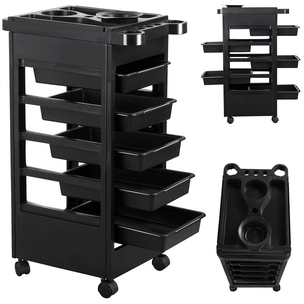 Az 5 fiókos fodrászkocsi tökéletes választás fodrászok és szépségszalonok számára, akik rendszerezett és hatékony munkavégzésre vágynak. A kihúzható tálcák bőséges tárolóhelyet biztosítanak, míg a hajszárítótartó és festékkeverő tál megkönnyíti a mindennapi használatot. Gurulós kialakításának köszönhetően könnyen mozgatható, tartós műanyagból készült, így hosszú élettartamú és könnyen tisztítható.
