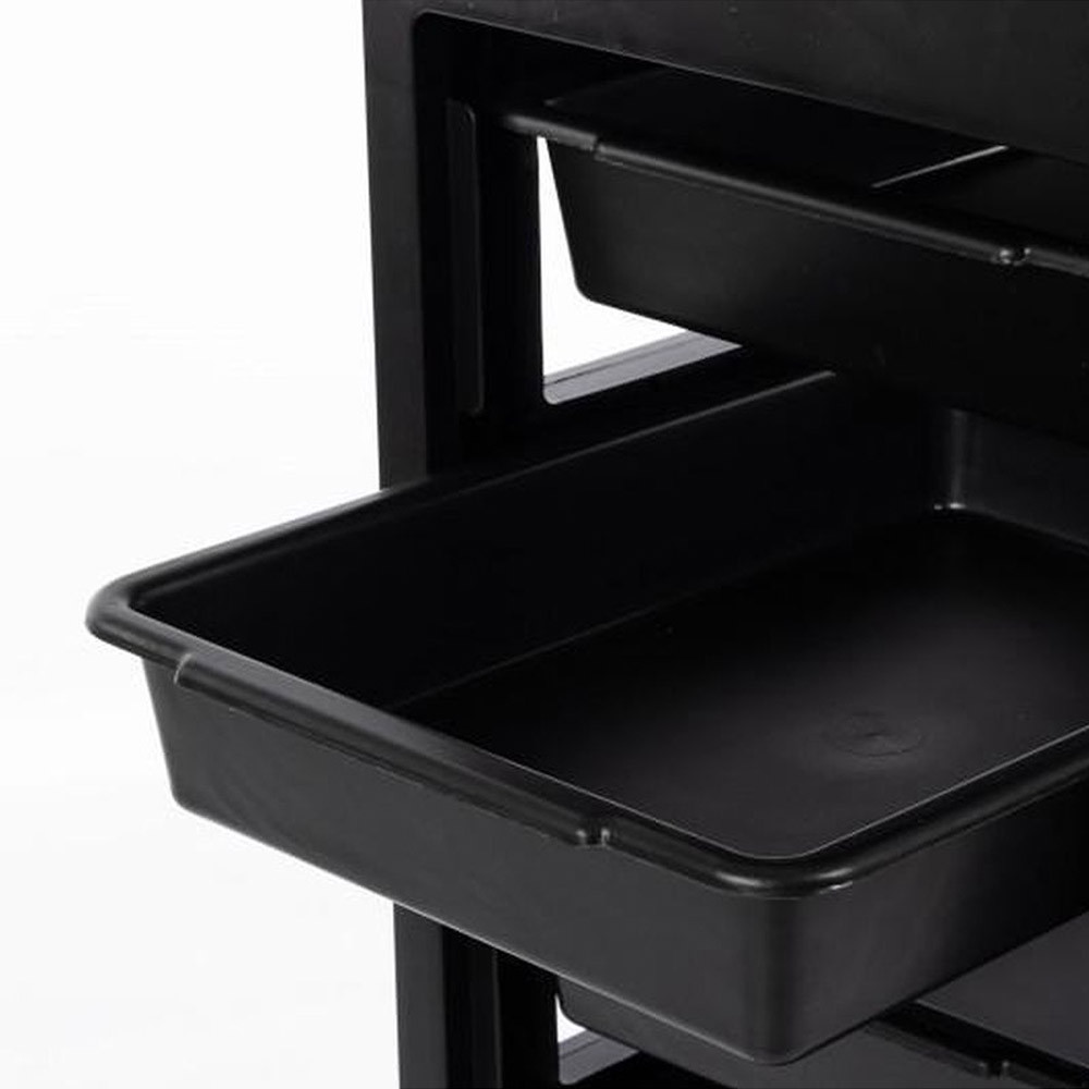 Az elegáns, fekete kocsi kiváló minőségű műanyagból készült, amelyet a négy keréknek köszönhetően különösen gyorsan és egyszerűen mozgathatunk. Könnyű kezelni és tisztítani.