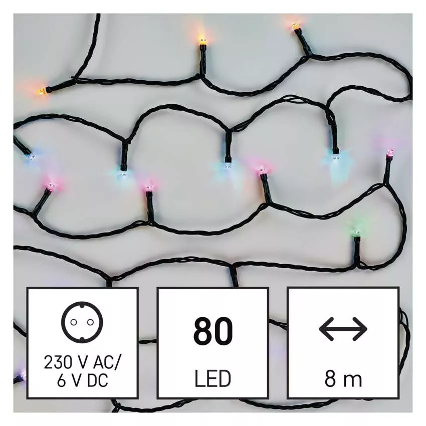 termék: lánc, fény színe: RGB, méretek: 8 m, használat: kültéri és beltéri, időzítő, távvezérlő: nem, funkció: 64 üzemmód (multifunkcionális), tápellátás típusa: AC (hálózati) adapter, LED-ek száma: 80, tápvezeték hossza: 5 m, a fa magasságához: nincs megadva, kábel színe: fekete, fogyasztás: 8,4 W, bemeneti feszültség: 230 V AC, kimeneti feszültség: 6 V DC, csatlakoztatási lehetőség: nem, védettség: IP44, élettartam: 10 000 óra, anyag: PVC, garancia-időszak: 2 év, értékesítési csomagolás: 1 db, doboz