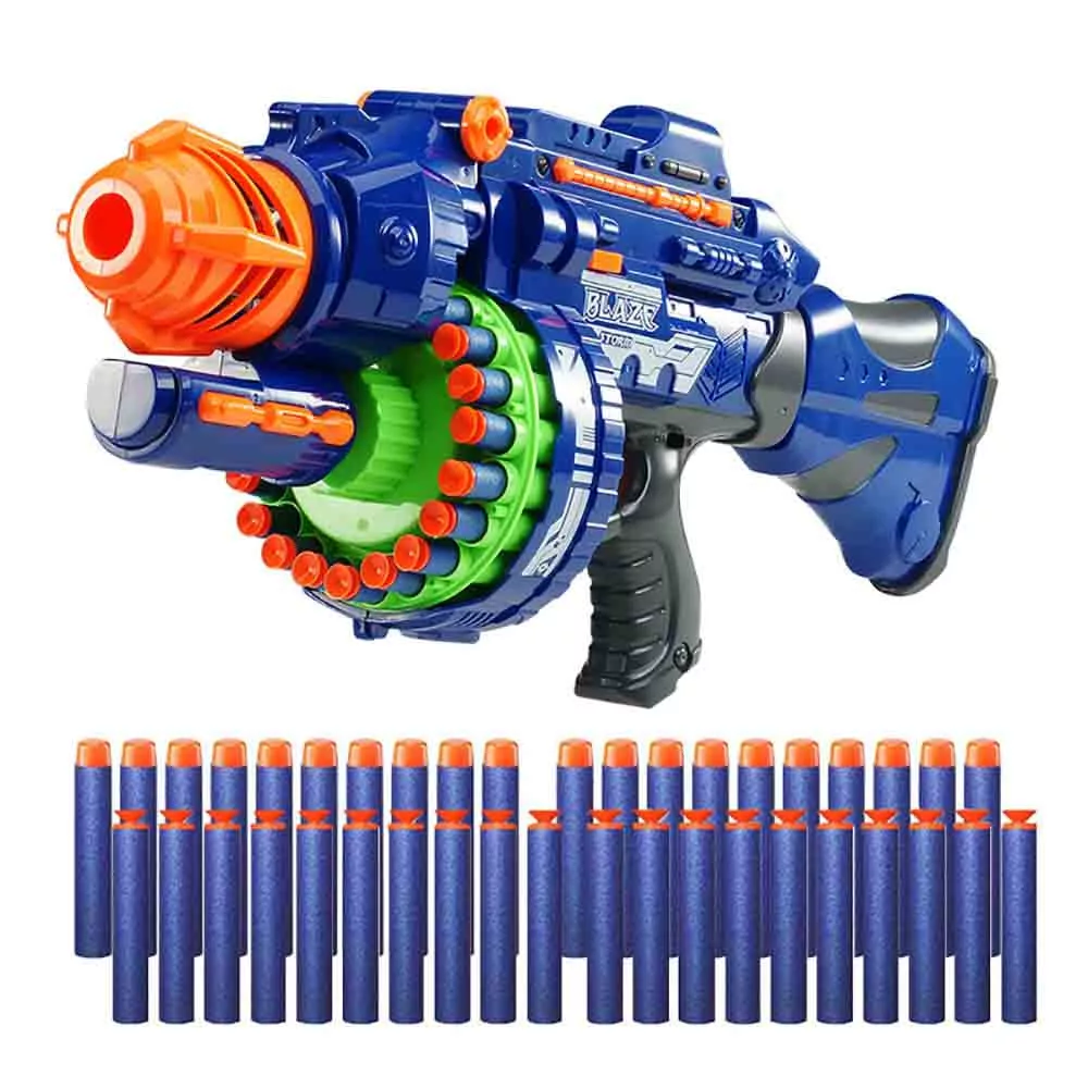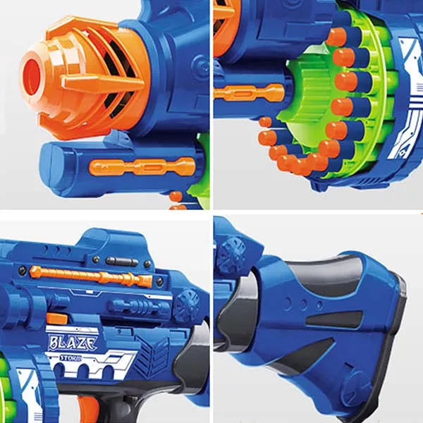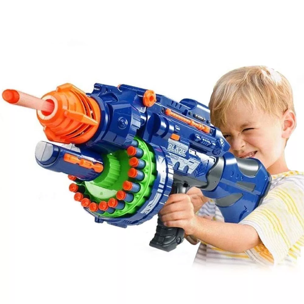 A hatalmas játékfegyver a gyerekek kedvenc játéka lesz, amit kültéren és beltéren is egyaránt használhatnak. A fegyver tárába 20 db puha töltény helyezhető el. A csomaghoz 40 db sima töltény tartozik, ezen felül ajándékba küldünk 40 db tapadókorongos lövedéket is. A fegyver a tár megtöltése és bekapcsolás után rögtön használható, használat közben hangot ad ki, amivel még élvezetesebbé teszi a játékot. A játék szürke és kék színben is elérhető.