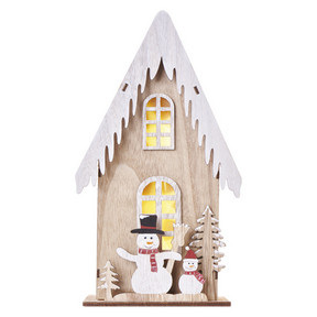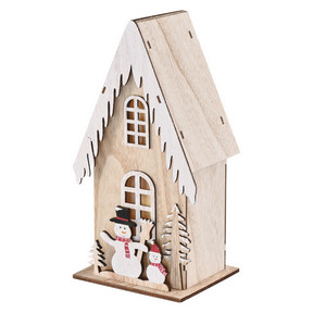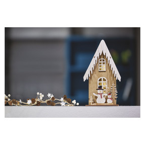 LED dekoráció, fa – házikó hóemberekkel, 28,5 cm, 2x AA, beltéri, meleg fehér, időzítő
