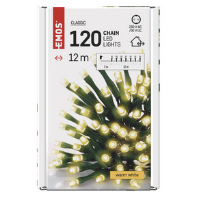 termék: lánc, fény színe: meleg fehér, méretek: 12 m, használat: kültéri és beltéri, időzítő, távvezérlő: nem, funkció: világít, tápellátás típusa: AC (hálózati) adapter, forma: klasszikus, LED-ek száma: 120, LED-ek közötti távolság: 10 cm, LED mérete: 5 mm, tápvezeték hossza: 5 m, a fa magasságához: 170 cm, kábel színe: zöld, fogyasztás: 3,6 W, bemeneti feszültség: 230 V AC, kimeneti feszültség: 31 V DC, csatlakoztatási lehetőség: nem, védettség: IP44, élettartam: 10 000 óra, anyag: PVC, garancia-időszak: 2 év, értékesítési csomagolás: 1 db, doboz