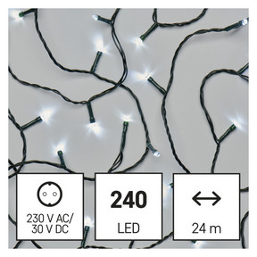 termék: lánc, fény színe: hideg fehér, méretek: 24 m, használat: kültéri és beltéri, időzítő, távvezérlő: nem, funkció: világít, tápellátás típusa: AC (hálózati) adapter, forma: klasszikus, LED-ek száma: 240, LED-ek közötti távolság: 10 cm, LED mérete: 5 mm, tápvezeték hossza: 5 m, a fa magasságához: 230 cm, kábel színe: zöld, fogyasztás: 6 W, bemeneti feszültség: 230 V AC, kimeneti feszültség: 31 V DC, csatlakoztatási lehetőség: nem, védettség: IP44, élettartam: 10 000 óra, anyag: PVC, garancia-időszak: 2 év, értékesítési csomagolás: 1 db, doboz