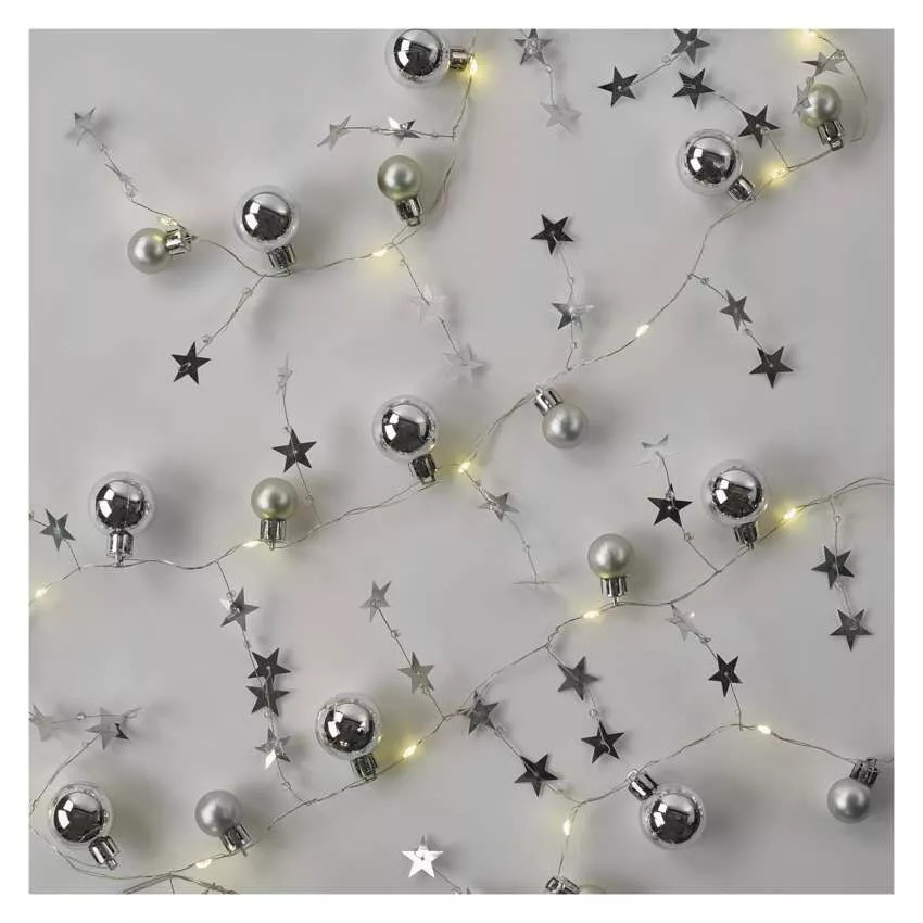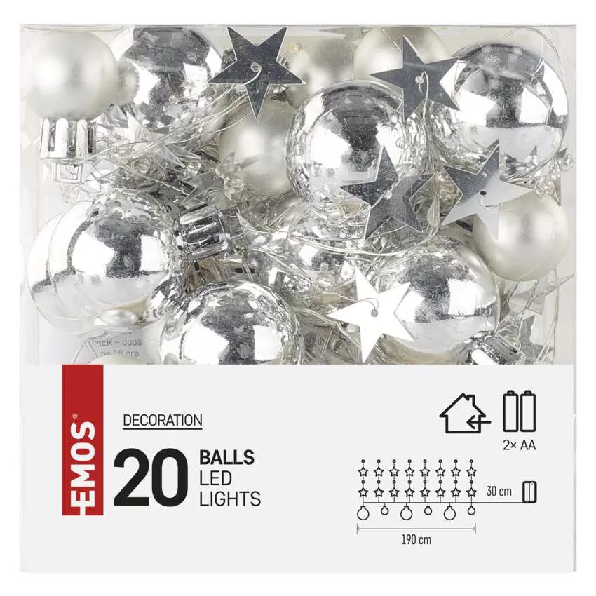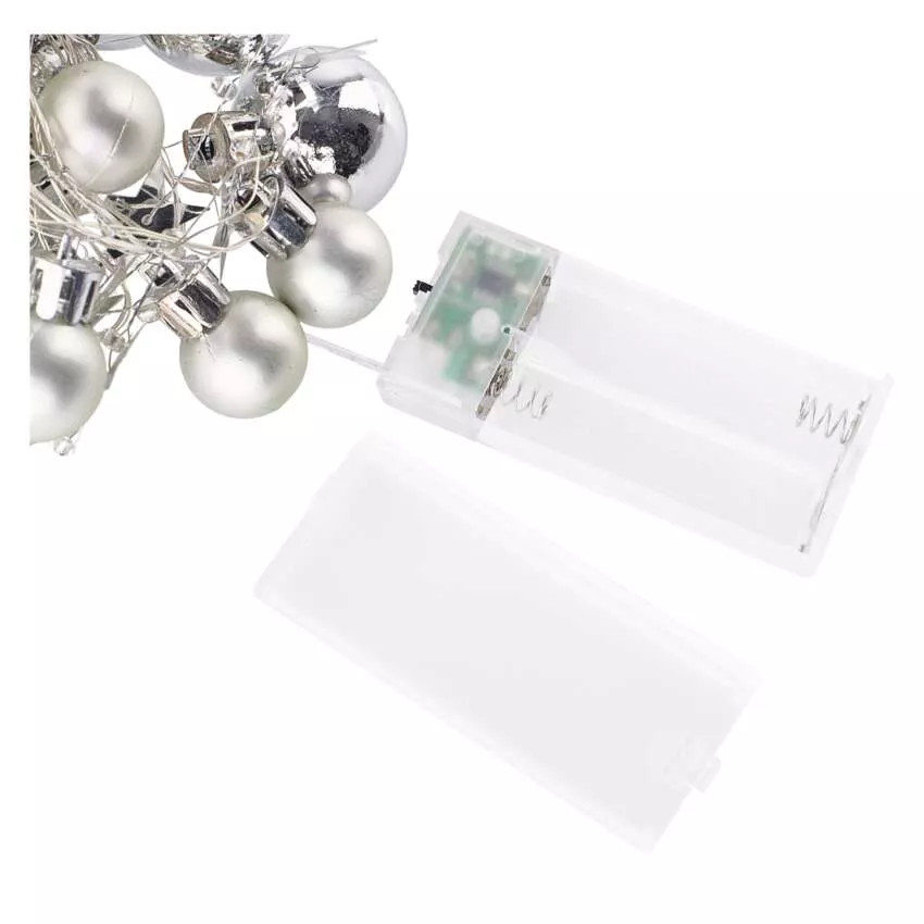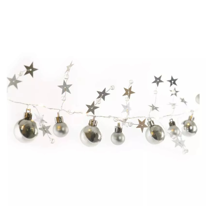 LED karácsonyi fényfüzér – ezüst gömb csillagokkal,1,9m, 2xAA, beltéri, meleg fehér, időz.