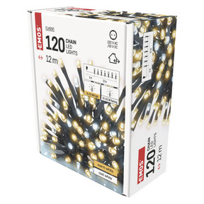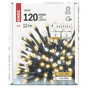 termék: lánc, fény színe: hideg/meleg fehér, méretek: 12 m, használat: kültéri és beltéri, időzítő, távvezérlő: nem, funkció: világít/villog, tápellátás típusa: AC (hálózati) adapter, forma: klasszikus, LED-ek száma: 120, LED-ek közötti távolság: 10 cm, LED mérete: 5 mm, tápvezeték hossza: 5 m, a fa magasságához: 170 cm, kábel színe: fekete, fogyasztás: 3,6 W, bemeneti feszültség: 230 V AC, kimeneti feszültség: 31 V DC, csatlakoztatási lehetőség: nem, védettség: IP44, élettartam: 10 000 óra, anyag: PVC, garancia-időszak: 2 év, értékesítési csomagolás: 1 db, doboz