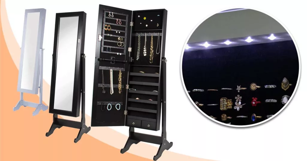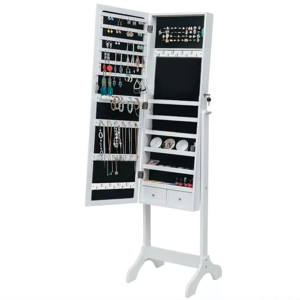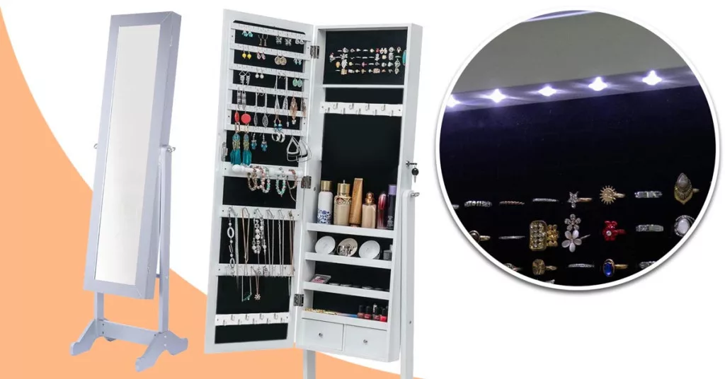 A szekrény tükrös ajtóval, puha plüss belső borítással, illetve horgokkal, akasztókkal és polcokkal van felszerelve. Az ajtó kinyitása után LED fény világítja meg a szekrény belsejét, így a tartalma jobban látható. A tükör mögött rengeteg ékszer, bizsu és más apróságok tárolására van lehetőség. A nyakláncok számára 3x9 db akasztó áll rendelkezésre, emellett gyűrűk, karkötők és fülbevalók tárolására is külön rész került kialakításra. A szekrény ajtaja egy kis kulccsal zárható, így illetéktelenek nem nyithatják ki. Letisztult formavilágának köszönhetően a legtöbb helyiségbe illik, tökéletes kiegészítője lehet egy hálószobának, fürdőszobának vagy nappalinak.