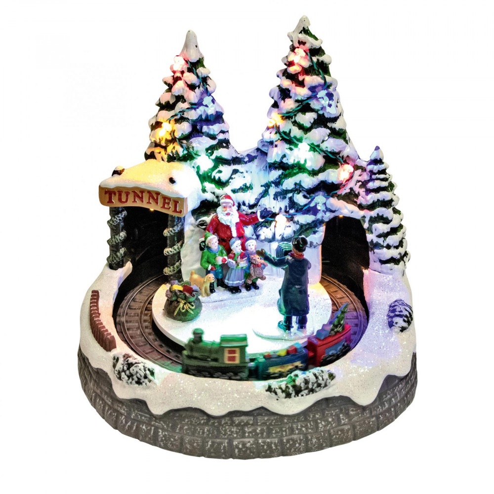 Világító karácsonyi életkép, fényképésszel, Mikulással és vonattal