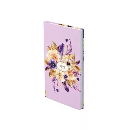 Színes grafikával díszített, matt fóliával bevont, fehér tömbös zsebnaptár, jelzőszalaggal.